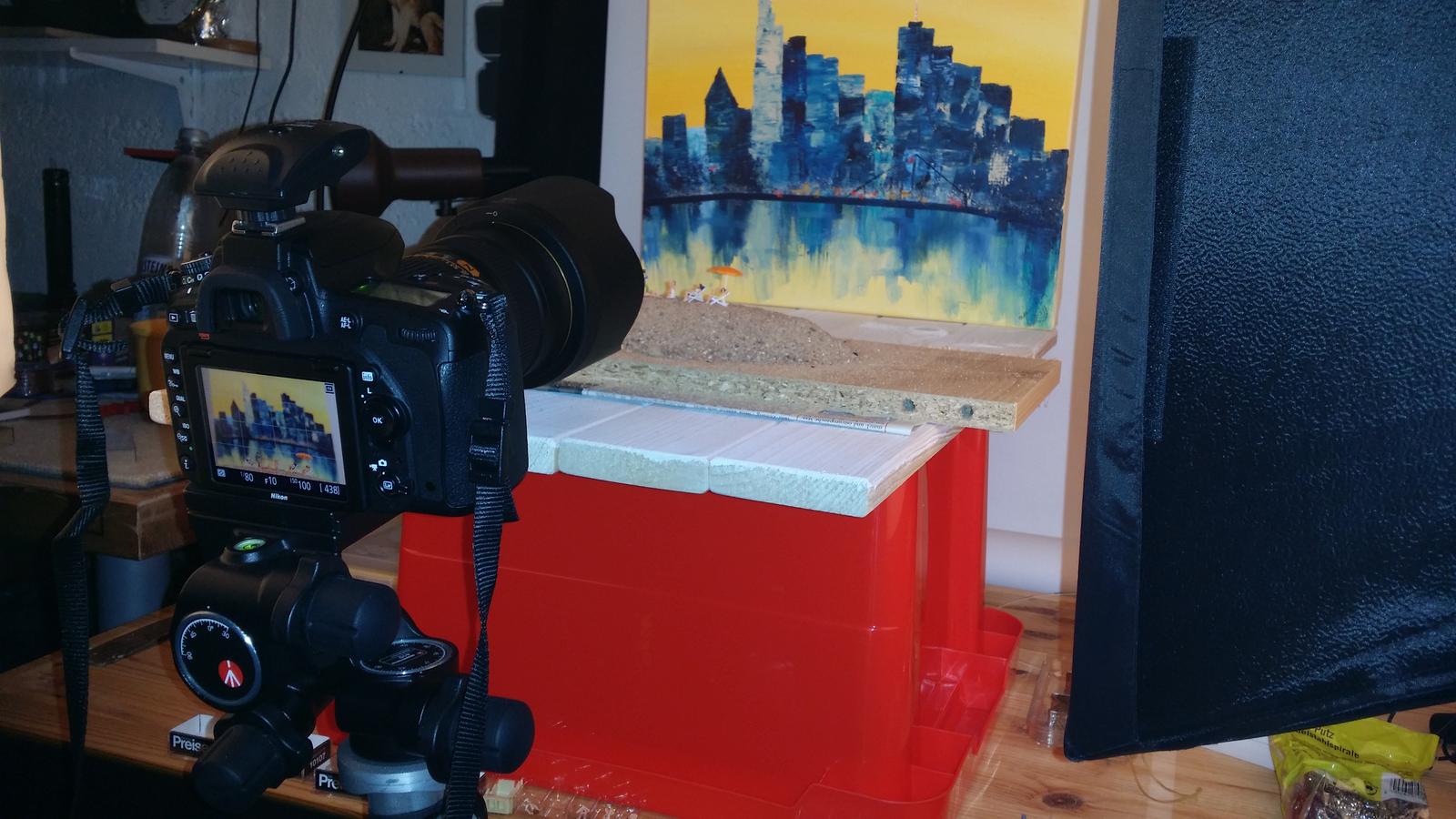 Die erste Fotosession fand im heimischen Keller statt. Ursprünglich hatte ich mir ein paar Figuren bestellt, um sie mit in den Urlaub zu nehmen. Aber meine Idee kam zu spät und die Lieferung erreichte mich nicht mehr rechtzeitig vor unserer Abreise. So lagen die kleinen Kerlchen einige Zeit in ihrer Box im dunklen Keller. Dann bat mich Heike, ein paar ihrer Gemälde mit der Frankfurter Skyline für ihren Kunstkalender abzufotografieren. Also ab in den Fotokeller und ein kleines Setup für Repro-Fotografie aufgebaut. Und plötzlich war sie da, die Idee für den "Frankfurt City-Beach". Schnell etwas Spielsand (was wir so alles im Haus haben!?!) aufgeschüttet, Heikes Bilder im Hintergrund arrangiert und die kleinen Figuren davor gesetzt - fertig war das erste Bild mit den kleinen Figuren!