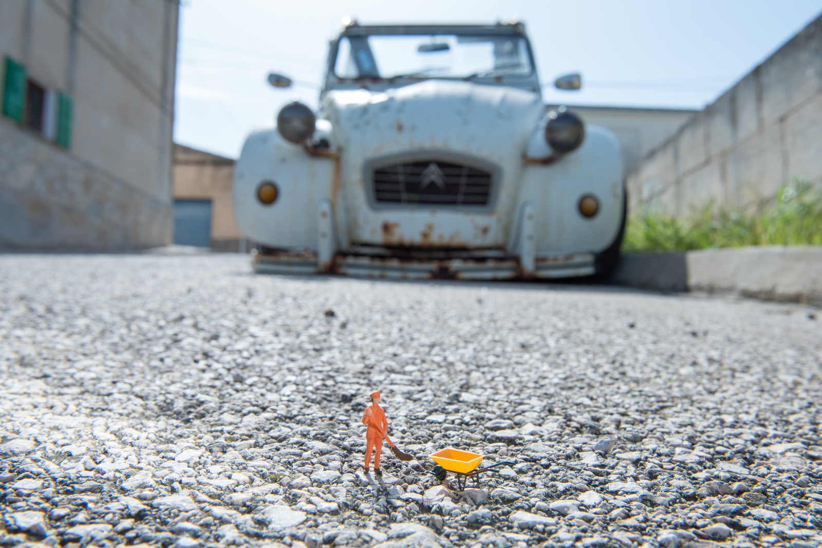 ...abgestellt und vergessen in einer Seitenstraße in irgendeinem Dorf auf Mallorca. Den Namen des Ortes habe ich gleich wieder vergessen. Während sich die Kunstmaler, die ich begleiten durfte nach geeigneten Motiven umgesehen haben bin ich alleine mit der Kamera durch die Straßen geschlichen. Und dabei habe ich dieses „Schmuckstück“ entdeckt. Ideal als Kulisse für die „Klaane Frankfurter“. Ein altes Paar sah mir von der Dachterrasse ihres Hauses eine ganze Weile zu, wie ich in allen möglichen Positionen um das alte Auto gekrabbelt bin, um die kleinen Figuren richtig in Szene zu setzen. Ein Winken und ein freundliches „Hola“ wurde von den Alten in keinster Weise erwidert. Sie schauten nur mürrisch meinem Treiben zu. Möchte nicht wissen, was die gedacht haben. Nach einiger Zeit kam ein Mann in einem Geländewagen angefahren, stieg aus und erkundigte sich auf Englisch, was ich hier tat. Ich zeigte ihm einige Bilder in der Kamera und dann sprach er mit den beiden Alten. Die hatten ihn wohl angerufen. Vielleich war er ja der Orts-Sheriff. Die beiden Alten haben sich dann ins Haus verzogen und ich konnte in Ruhe weiterknipsen. Die Mittagssonne war heftig, aber es hat sich gelohnt.